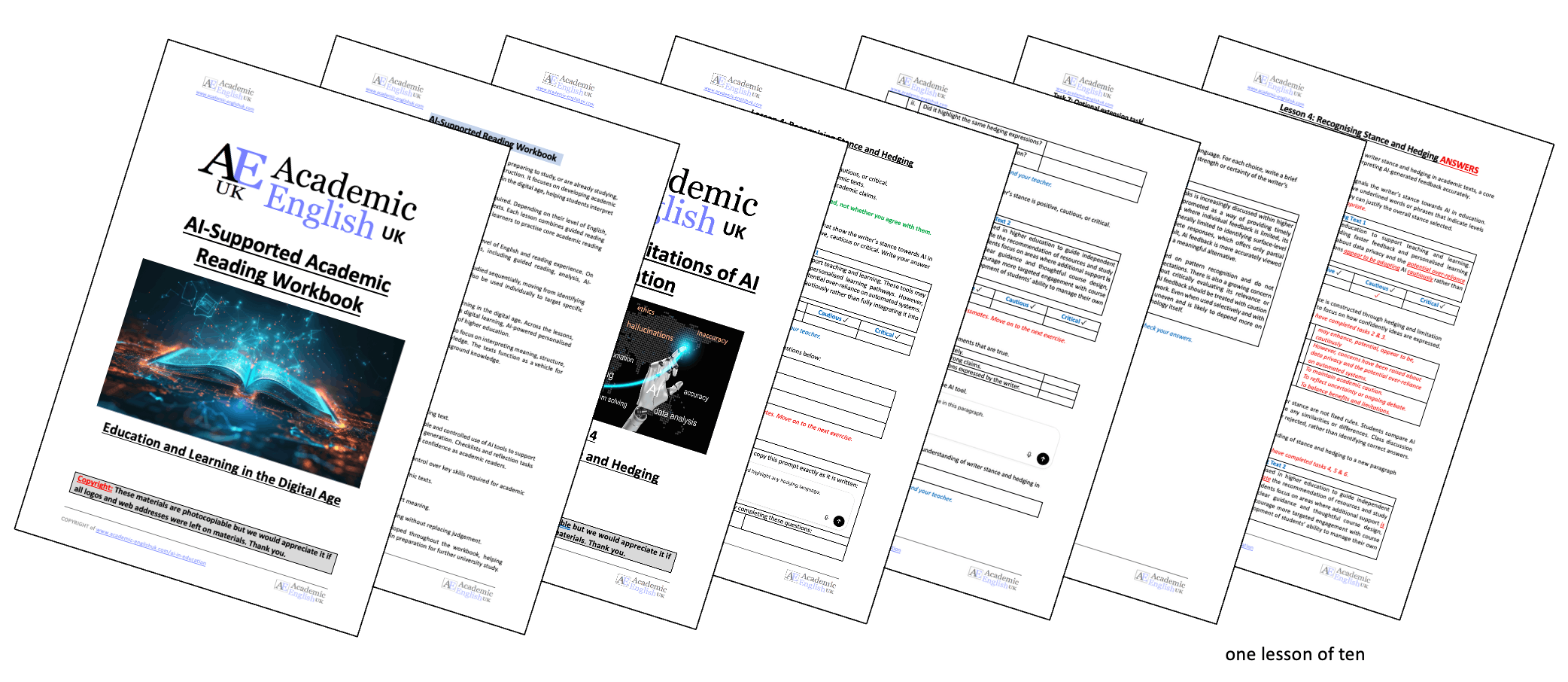 The AI-supported academic reading workbook helps international students develop core academic reading skills for university study. Lessons move from sentence-level understanding to paragraph and text analysis, using neutral academic themes linked to digital education. Students practise identifying main ideas, supporting details, reference, cohesion, and stance. AI tools are used in a controlled way to support checking and reflection rather than replace reading, supporting accurate comprehension, critical reading, and academic judgement. LESSON EXAMPLE Level ***** [B1/B2/C1] TEACHER MEMBERSHIP / INSTITUTIONAL MEMBERSHIP