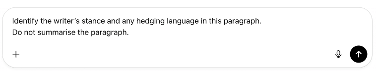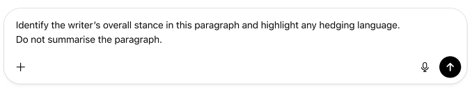 How did using AI help you confirm or question your understanding of writer stance and hedging in this lesson? Give ONE specific example.